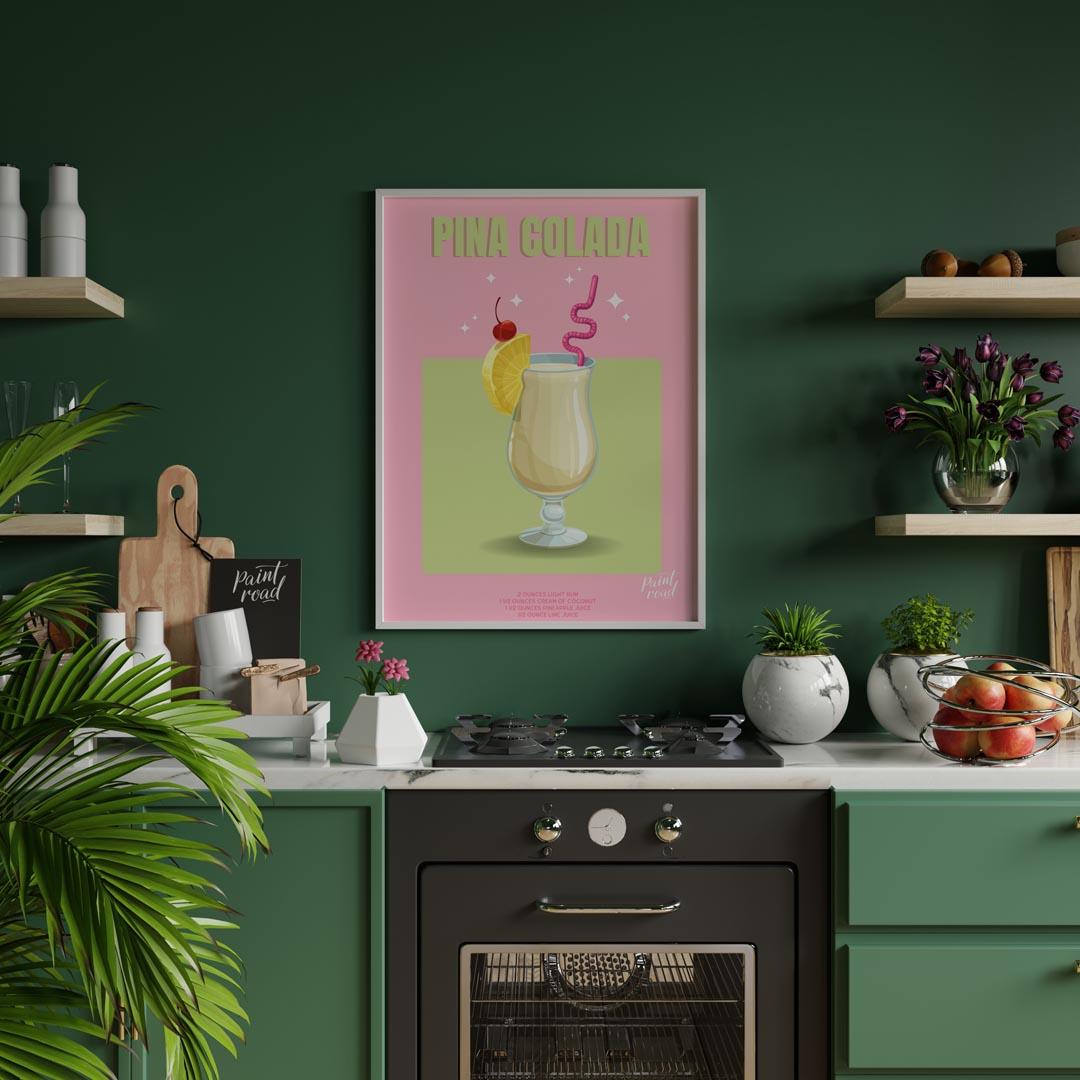 This charming and inviting poster showcases a Piña Colada, evoking a sweet escape to a tropical paradise. The creamy, pale yellow drink is presented in a gracefully curved hurricane glass, appearing smooth and rich. It's adorned with a vibrant red cherry, a sunny pineapple slice, and a playfully curly pink straw, all contributing to its festive and delightful appearance. Subtle starburst highlights around the glass add a touch of sparkle and magic. The illustration style is smooth and appealing, with soft shading that gives the drink and glass a pleasant dimension. The background features a bright, refreshing pale green rectangle, set against a cheerful pink outer background, creating a whimsical and joyful tropical palette. Above the illustration, "PINA COLADA" is boldly displayed in a light green, sans-serif font, promising a taste of vacation. Below the image, the recipe ingredients are clearly listed in ounces: 2 ounces light rum, 1 1/2 ounces cream of coconut, 1 1/2 ounces pineapple juice, and 1/2 ounce lime juice. This poster is ideal for anyone who loves sweet, creamy, and tropical cocktails, bringing a bright, cheerful, and relaxed vacation vibe to any space. It would be an excellent decorative piece for a kitchen, dining area, patio, or a fun-filled living room, perfect for dreaming of sunny beaches.