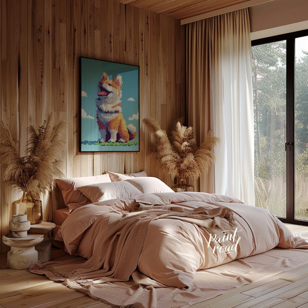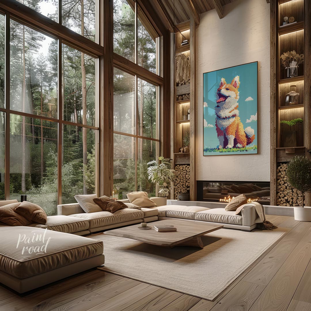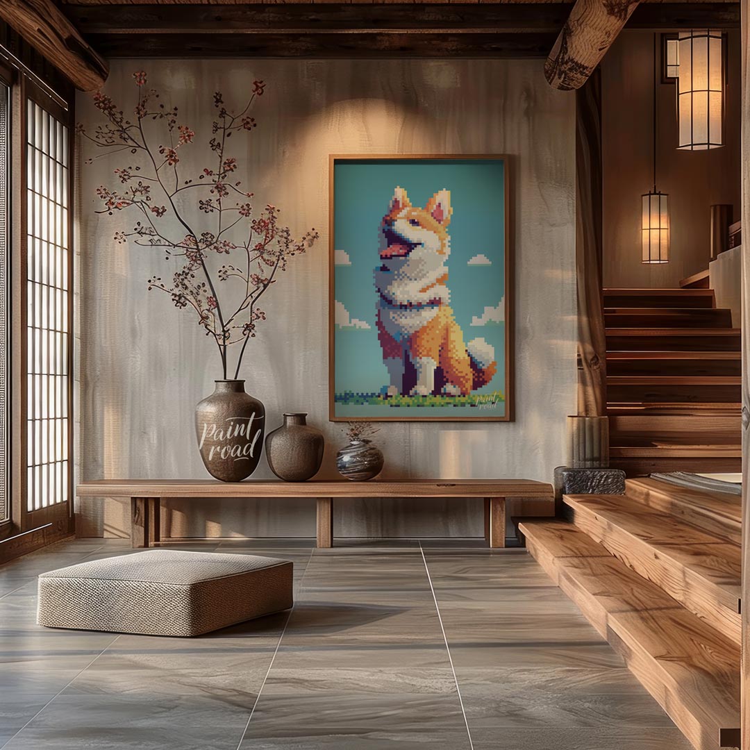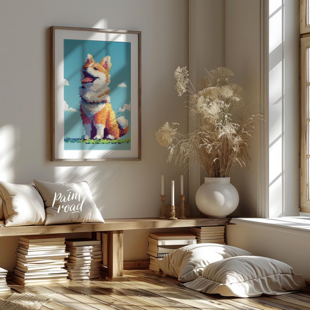 This charming poster features a cheerful Shiba Inu dog rendered in a distinct pixel art style, reminiscent of classic video games. The dog is depicted sitting proudly on a patch of green grass, with its characteristic orange-red and white fur beautifully translated into large, distinct pixels. Its happy expression is highlighted by its open mouth, extended tongue, and bright, triangular ears. The background is a simple, clear blue sky with a few small, blocky white clouds, further emphasizing the retro pixelated aesthetic. The minimalist yet expressive style captures the popular breed's personality in a fun and nostalgic way. This piece is perfect for those who appreciate digital art, video game aesthetics, or simply the cuteness of a Shiba Inu.