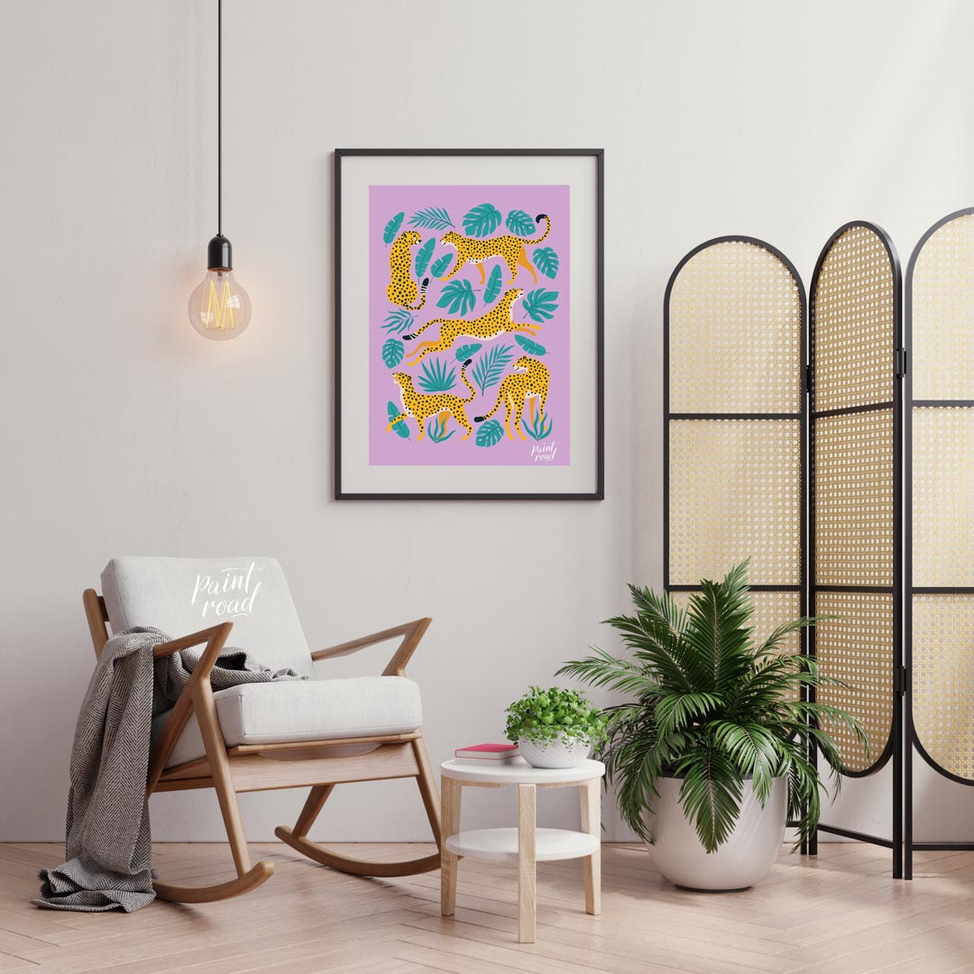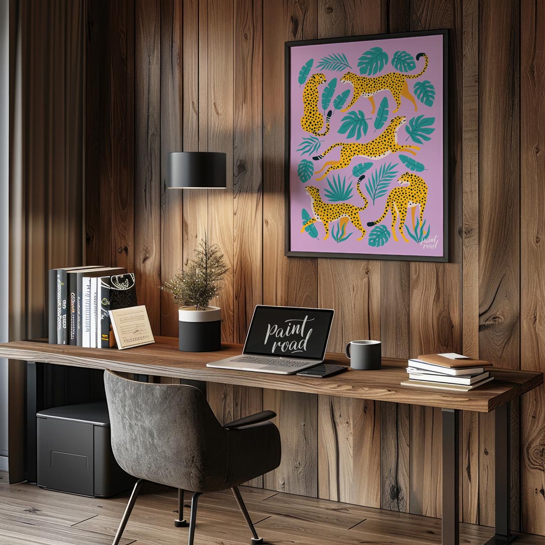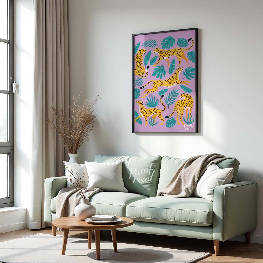 This vibrant and whimsical artwork features an array of stylized leopards in various playful poses, set against a soft lavender-pink background. Each leopard is depicted with its characteristic yellow fur and black spots, contrasting beautifully with the cool tones of the large, illustrative green and teal tropical leaves that are scattered throughout the composition. The simplified forms and bold colors give the piece a modern, graphic feel, making it both artistic and fun. The different poses of the leopards, from resting to leaping, create a dynamic and engaging visual narrative. This artwork is perfect for adding a touch of playful exoticism and contemporary flair to a space, particularly for those who love animals and bold design.