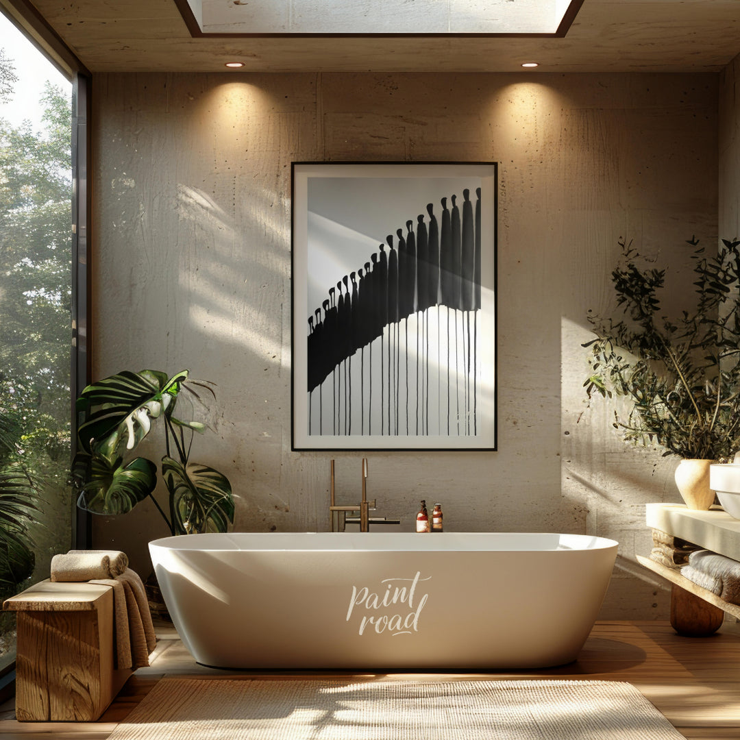 """Procession"" presents a striking abstract composition featuring a line of silhouetted figures rendered in bold black ink against a light background. The figures appear to be marching or standing in a row, creating a sense of movement and collective presence. The dripping ink effect adds a dramatic, almost ghostly quality to the design. This piece balances a sense of minimalism with a powerful narrative, inviting the viewer to contemplate themes of anonymity and unity."