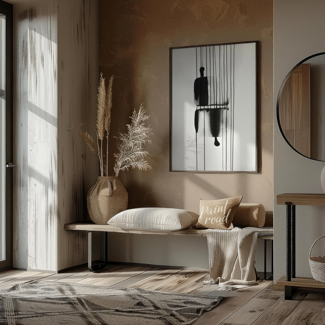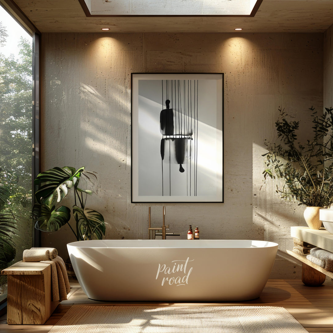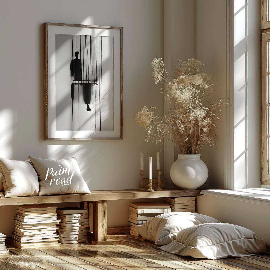 "Suspended Figure" presents a striking abstract composition featuring a dark, silhouetted figure suspended between a series of vertical lines. The figure appears to be fragmented or reflected, creating a sense of duality and visual intrigue. The use of black ink against a light background enhances the dramatic effect. This piece balances a sense of mystery with a minimalist aesthetic, inviting contemplation on themes of isolation and connection. The artwork's stark contrasts and clean lines create a visually compelling experience.