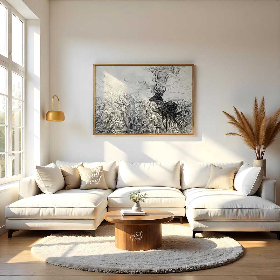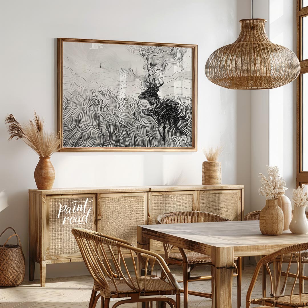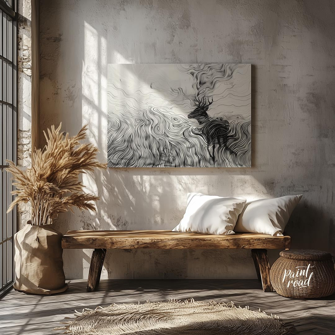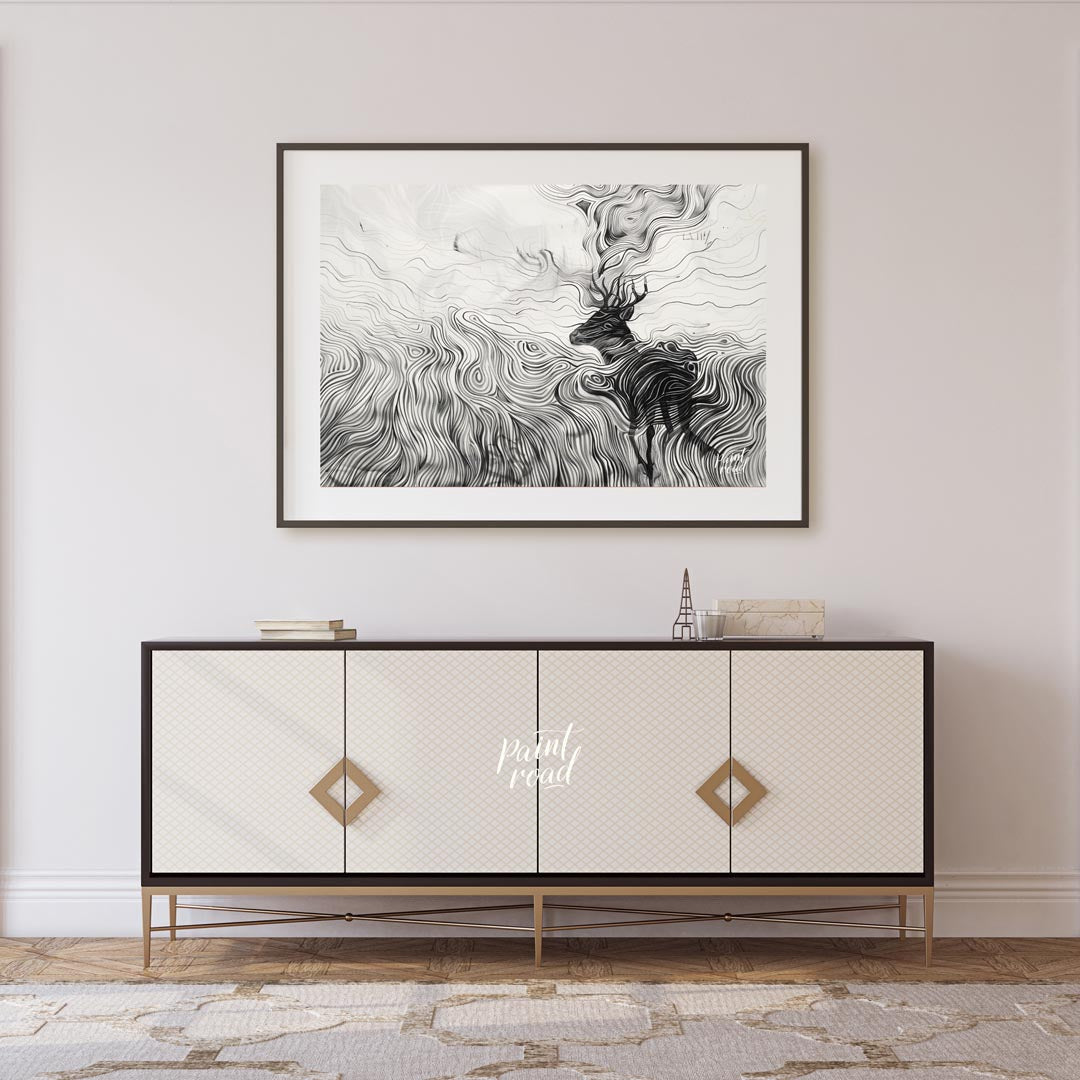 This captivating monochromatic artwork depicts a stag enveloped by a mesmerizing landscape of swirling, organic lines. The stag itself is rendered in dark, dense lines, its form emerging from the intricate patterns that define its body and antlers. The background is a vast expanse of similar, fluid lines that ripple and flow, creating a sense of movement and an almost hypnotic effect. The entire piece is executed in shades of black, grey, and white, emphasizing texture, form, and the dynamic interplay of lines. The swirling patterns create an illusion of depth and a dreamlike quality, as if the stag is part of the very fabric of its environment. This unique and sophisticated piece is perfect for those who appreciate abstract and minimalist art with a strong natural theme, adding a modern and contemplative element to any space.