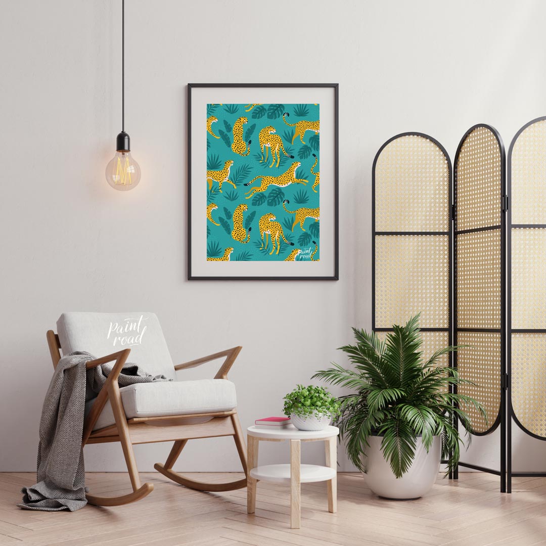 This vibrant and energetic artwork presents a seamless pattern of stylized leopards interspersed with lush tropical foliage, set against a rich teal background. The leopards, with their distinctive yellow fur and black spots, are depicted in dynamic poses, creating a sense of movement and vitality. Large, illustrative green and blue tropical leaves are scattered throughout, adding depth and a feeling of dense jungle. The repetition of the elements creates a visually engaging pattern, while the bold color combination of teal, yellow, and black makes it pop. This artwork is perfect for adding a lively and exotic touch to any space, especially for those who appreciate modern, graphic patterns and animal themes.
