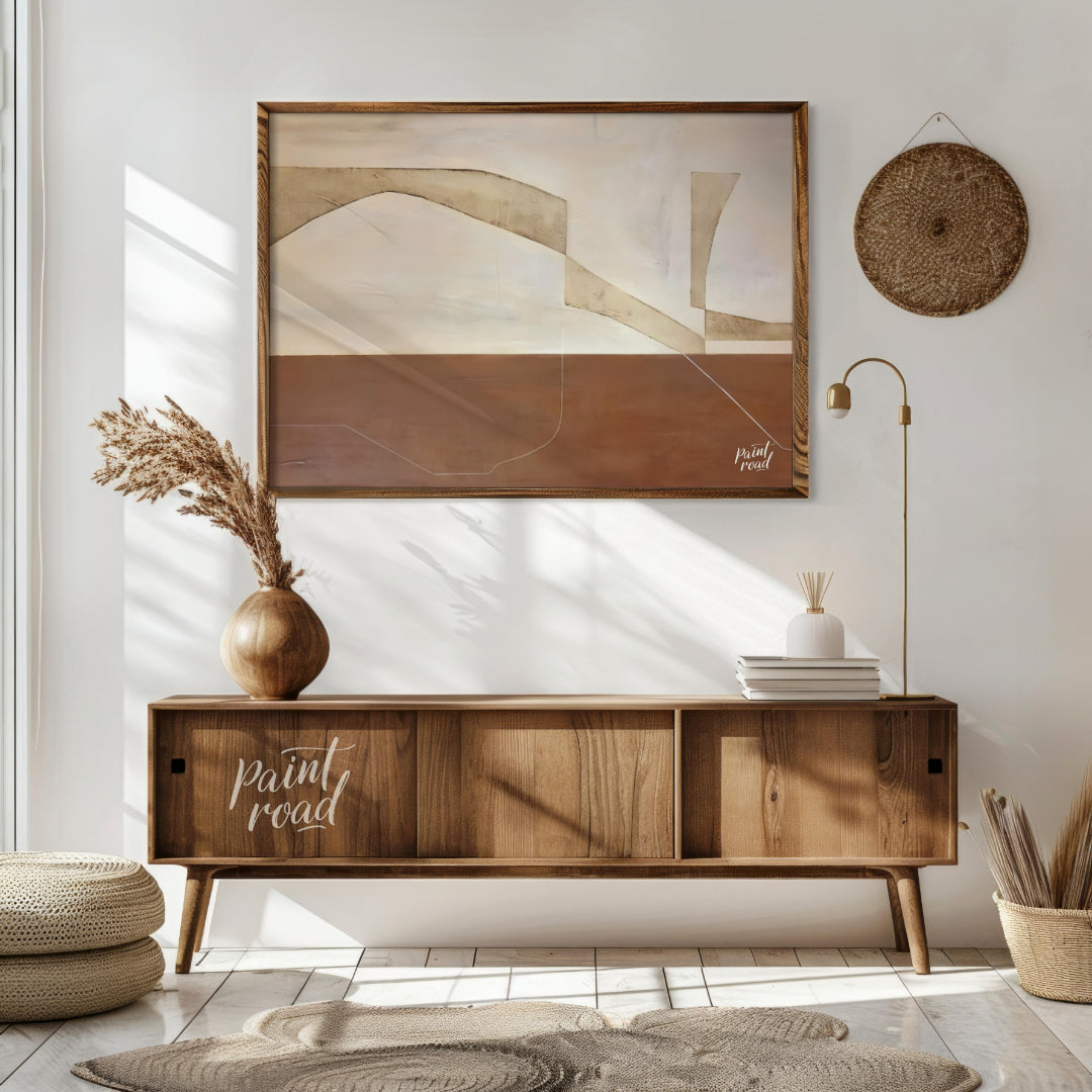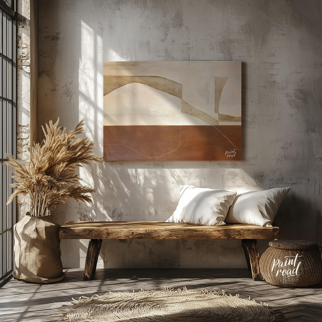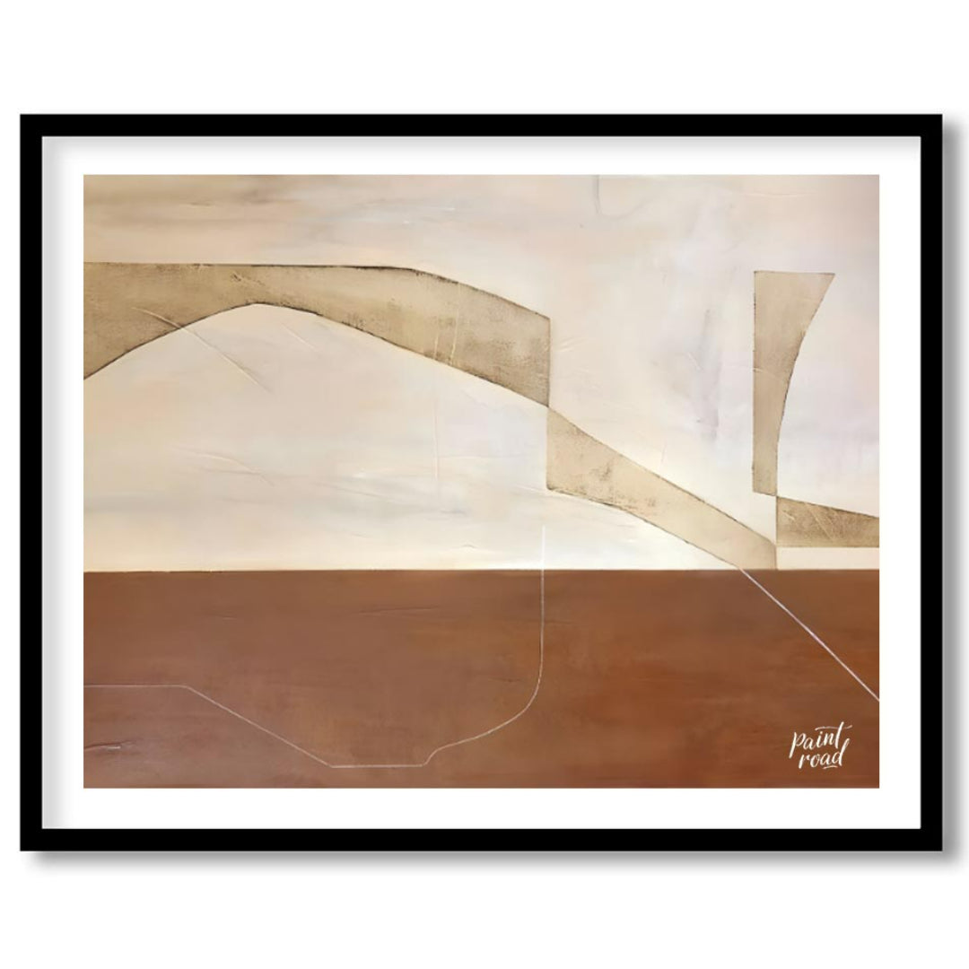 """Terra Arches"" presents a serene composition of abstract forms and earthy tones, evoking a sense of landscape and architectural elements. The artwork features soft, rounded arches in neutral hues juxtaposed against a solid, warm brown plane. The subtle textures and delicate lines add depth and a tactile quality to the design. The interplay of light and shadow creates a sense of spatial depth, inviting the viewer to explore the abstract landscape. This piece balances a sense of tranquility with a minimalist aesthetic, making it a compelling exploration of form and color."