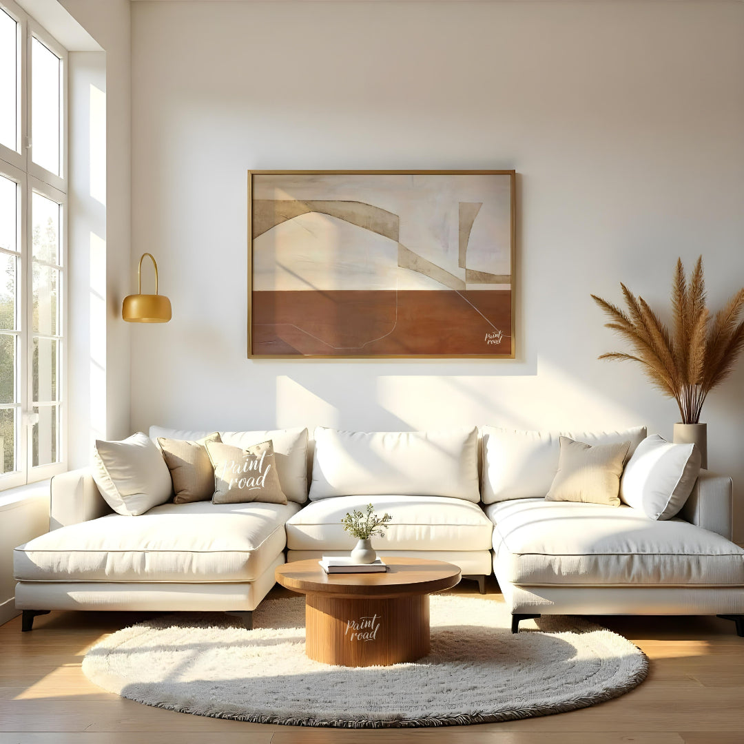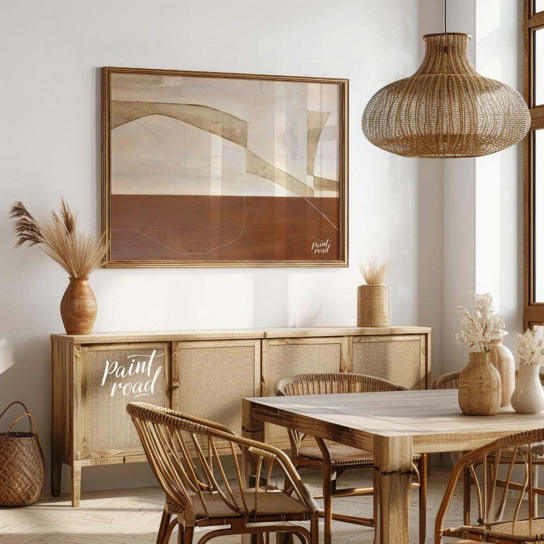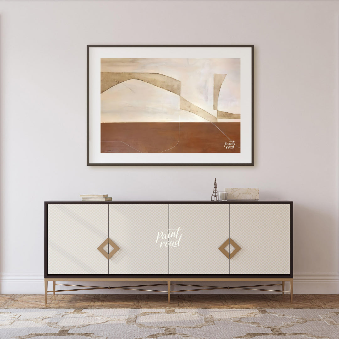 """Terra Arches"" presents a serene composition of abstract forms and earthy tones, evoking a sense of landscape and architectural elements. The artwork features soft, rounded arches in neutral hues juxtaposed against a solid, warm brown plane. The subtle textures and delicate lines add depth and a tactile quality to the design. The interplay of light and shadow creates a sense of spatial depth, inviting the viewer to explore the abstract landscape. This piece balances a sense of tranquility with a minimalist aesthetic, making it a compelling exploration of form and color."