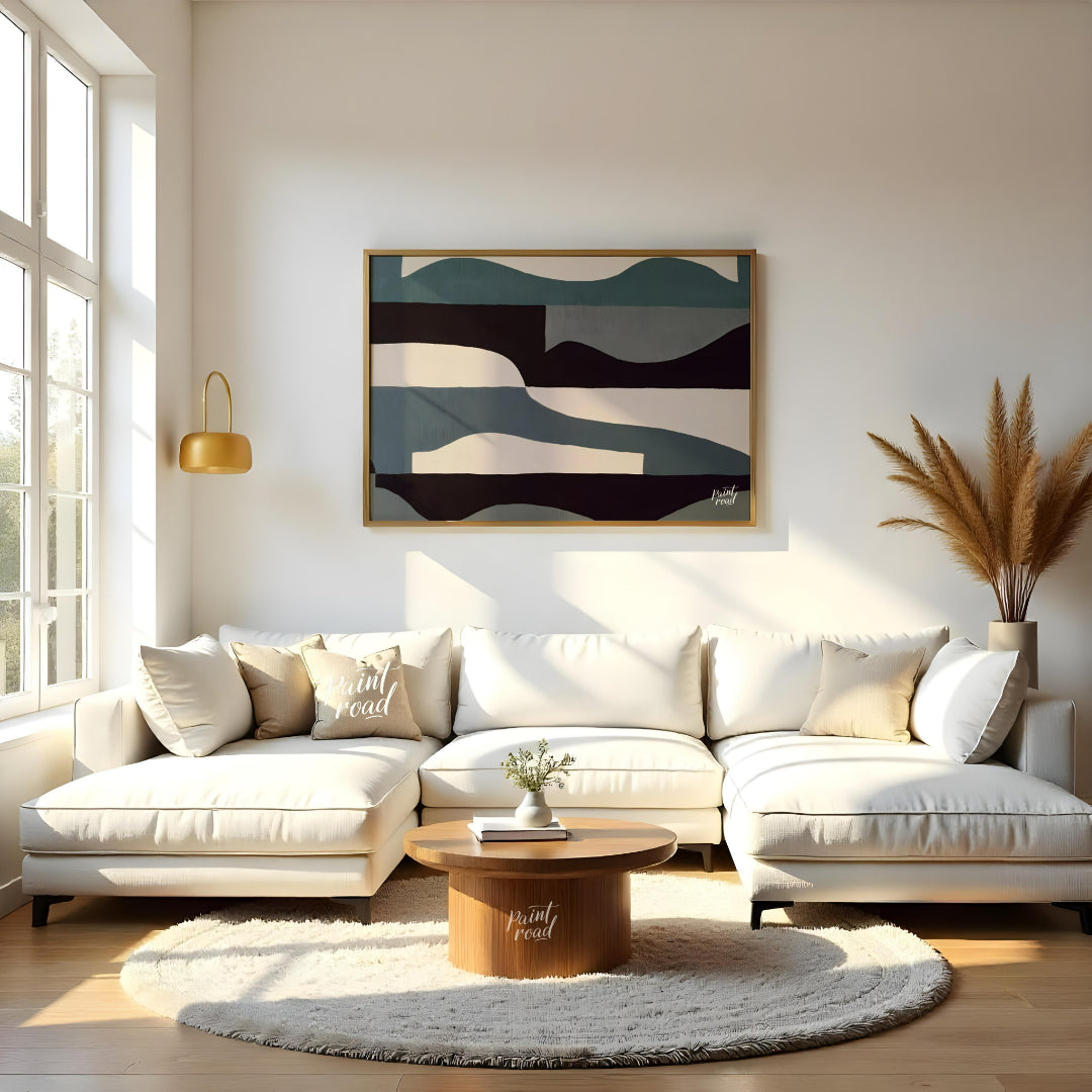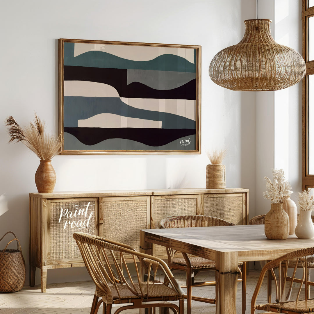 """Tidal Abstraction"" presents a compelling composition of abstract shapes in a harmonious palette of dark blue, grey, black, and white. The forms appear to flow and overlap, creating a sense of dynamic movement reminiscent of tidal patterns. The interplay of light and dark areas adds depth and visual intrigue. The clean lines and geometric forms suggest a modern, minimalist aesthetic. This piece balances a sense of organic fluidity with structured design, inviting the viewer to explore its rhythmic patterns and spatial relationships."
