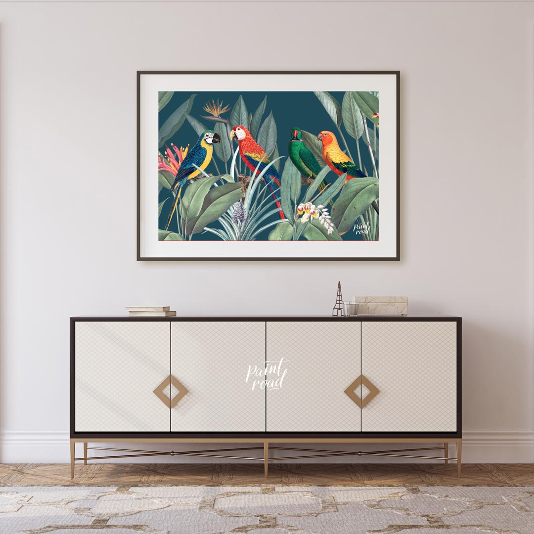 This vibrant and lush illustration captures a lively gathering of four colorful parrots amidst a rich tapestry of tropical foliage and exotic flowers. Each parrot is uniquely colored: a blue and yellow macaw, a red and yellow macaw, a green parrot, and an orange and yellow parrot, showcasing the stunning diversity of these birds. They are perched on branches and nestled among oversized green leaves, red and pink bromeliads, and delicate white orchids, all rendered with meticulous detail. The dark teal or deep blue background enhances the vibrancy of the birds and plants, giving the scene a dense, jungle-like atmosphere. This artwork is a celebration of tropical biodiversity, bringing a burst of color and exotic flair to any space.