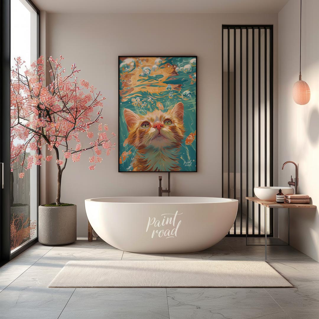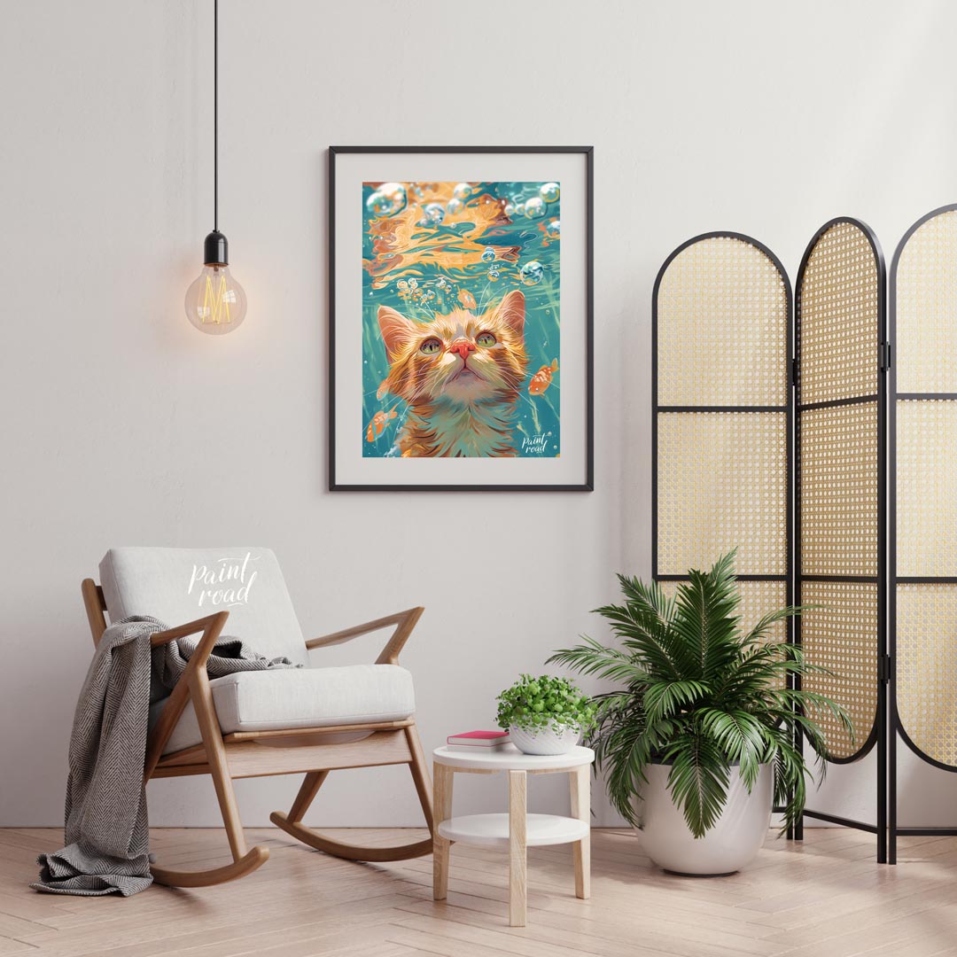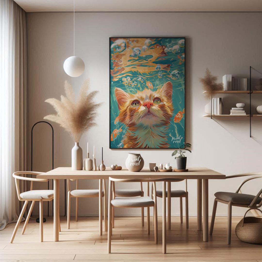 This captivating digital painting presents a unique perspective of a ginger cat looking upwards from beneath the water's surface. The cat's large, luminous green eyes are the focal point, reflecting the dappled sunlight and bubbles above. The water is depicted in beautiful shades of turquoise and blue, with golden light filtering through from the surface. Small, colorful fish swim around the cat, adding to the surreal underwater scene. The artistic style is illustrative and vibrant, with clean lines and bright colors, giving it a dreamy and ethereal quality. This imaginative artwork is both calming and intriguing, inviting viewers to ponder the world from a different viewpoint.