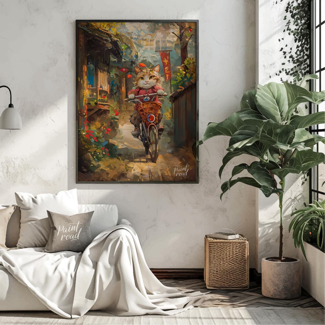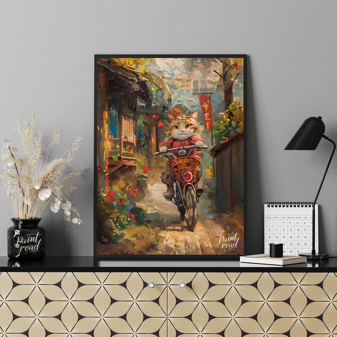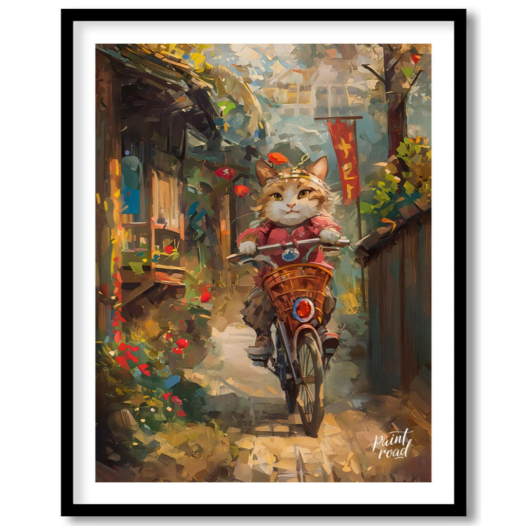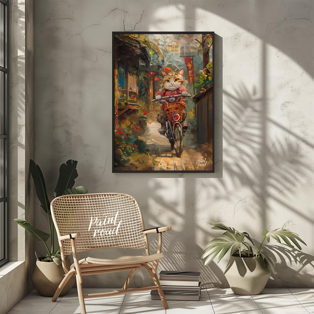 This vibrant digital painting portrays a curious cat, sporting a red outfit and a small hat, riding a bicycle through a narrow, bustling street. The setting appears to be an Asian-inspired alleyway, characterized by traditional architecture, hanging red lanterns, and lush green foliage with blooming red flowers. The artistic style is bold and expressive, with distinct, textured brushstrokes and a rich array of colors that bring the scene to life. The cat is at the center, confidently navigating its surroundings. The overall impression is one of lively urban exploration and cultural charm. This piece is full of character and intricate details.