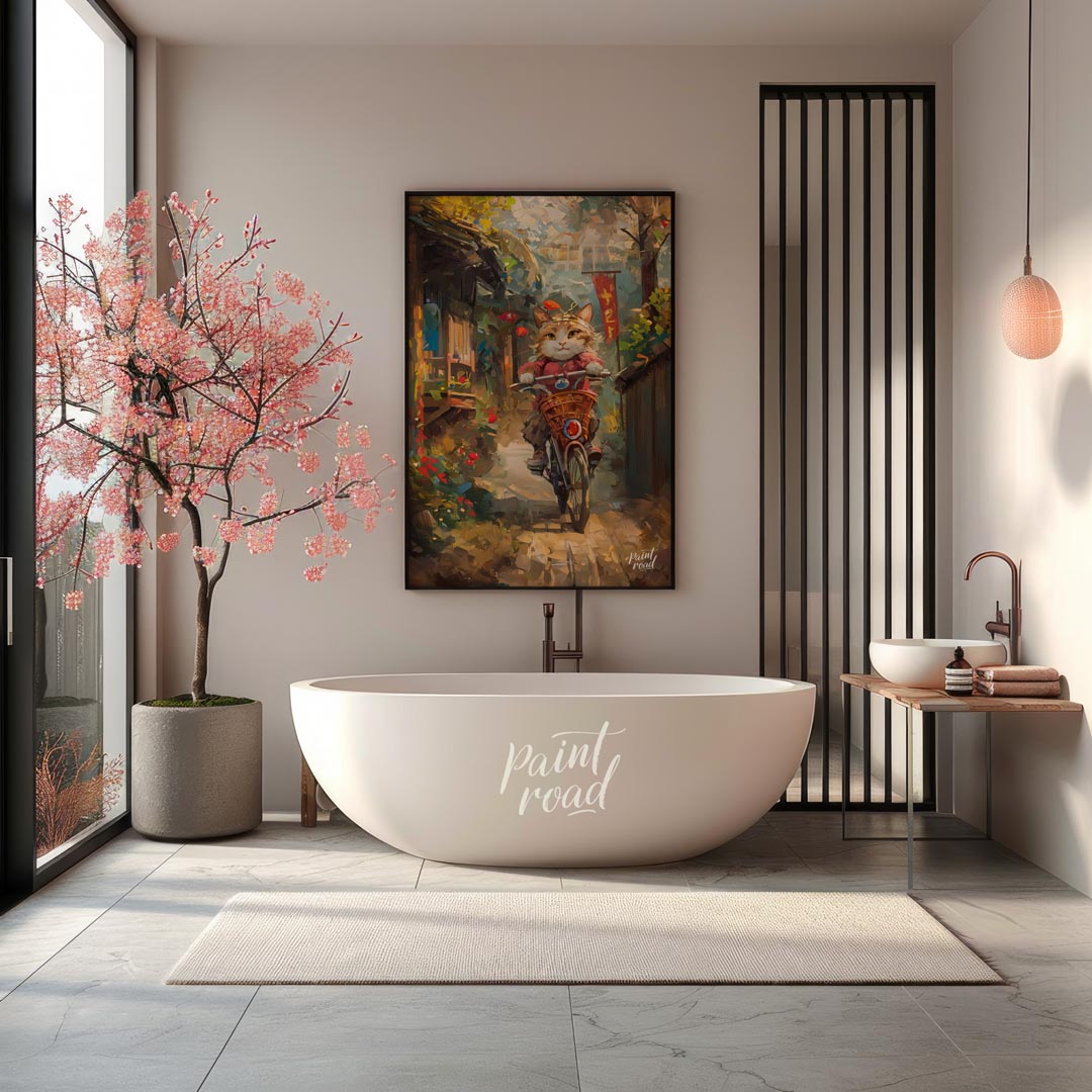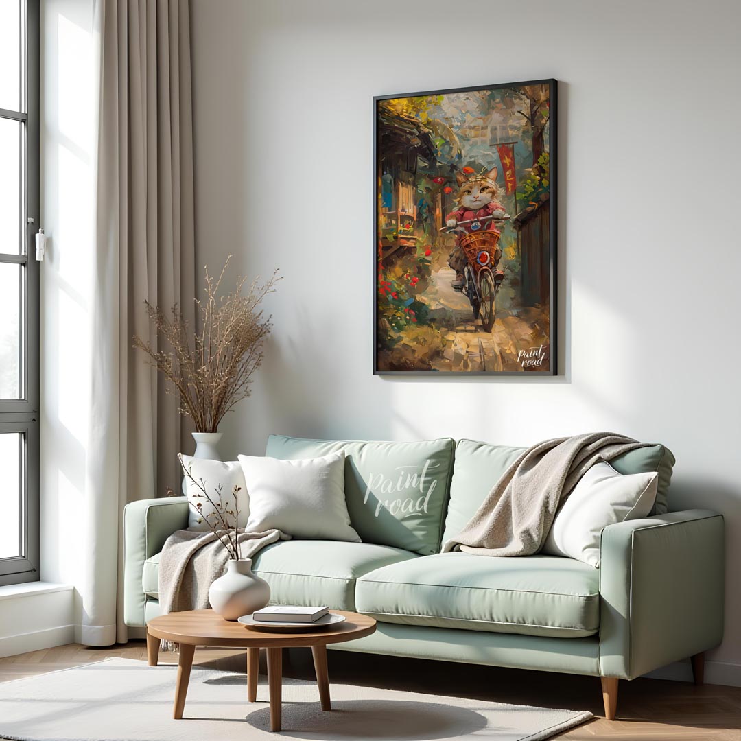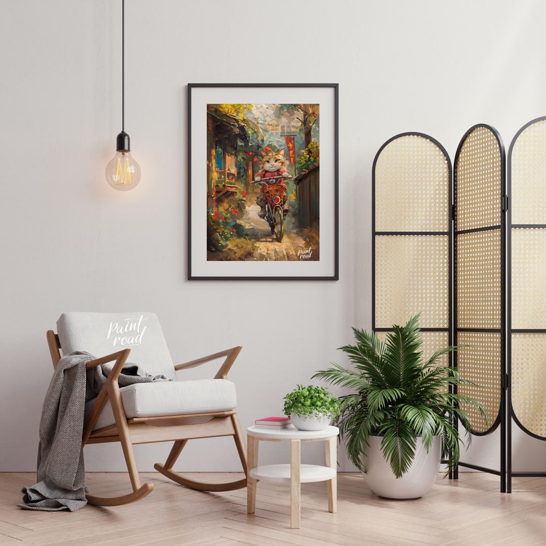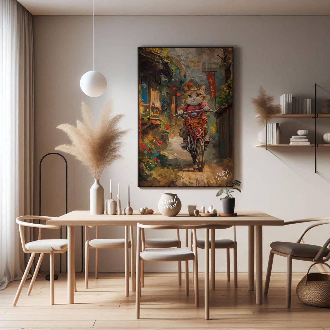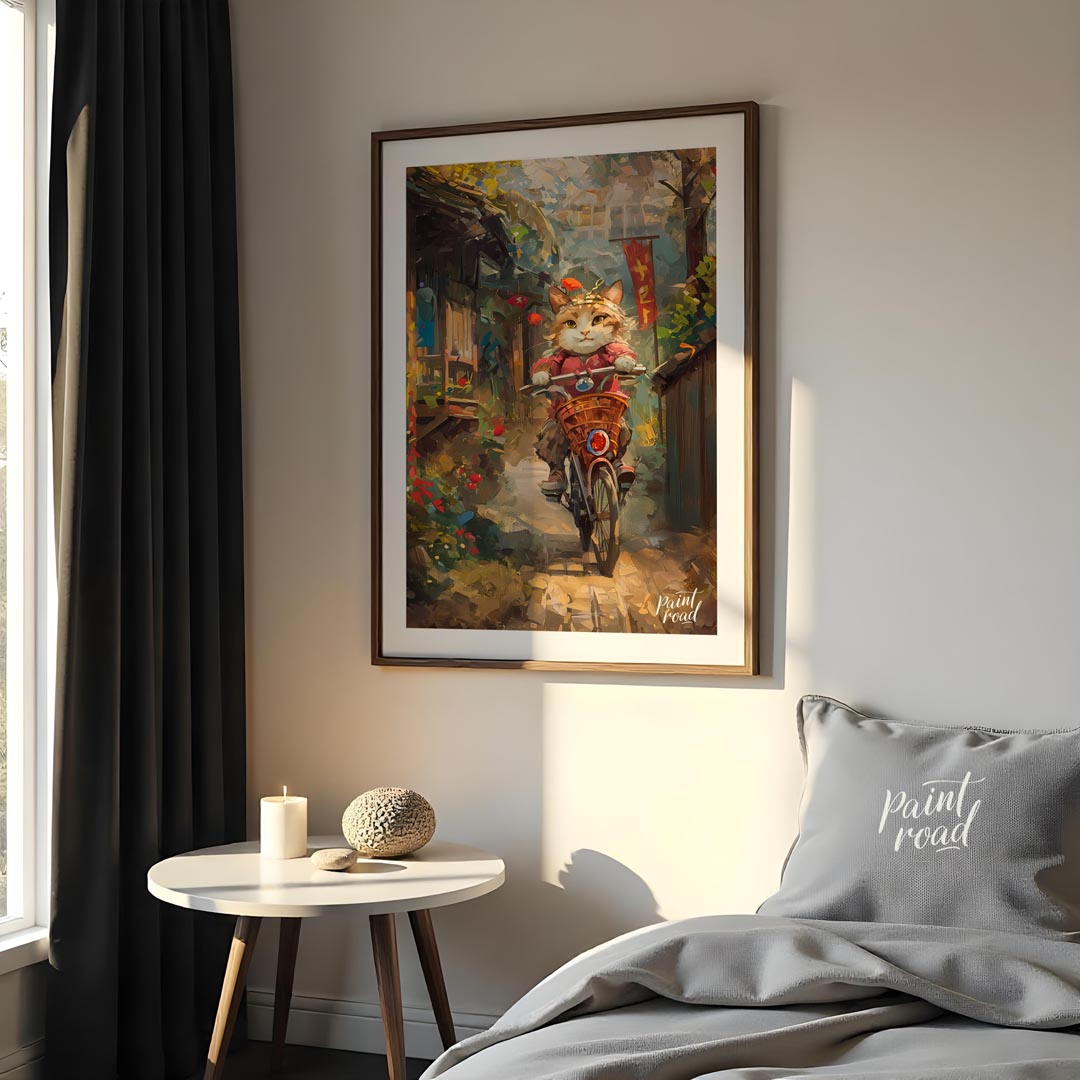 This vibrant digital painting portrays a curious cat, sporting a red outfit and a small hat, riding a bicycle through a narrow, bustling street. The setting appears to be an Asian-inspired alleyway, characterized by traditional architecture, hanging red lanterns, and lush green foliage with blooming red flowers. The artistic style is bold and expressive, with distinct, textured brushstrokes and a rich array of colors that bring the scene to life. The cat is at the center, confidently navigating its surroundings. The overall impression is one of lively urban exploration and cultural charm. This piece is full of character and intricate details.