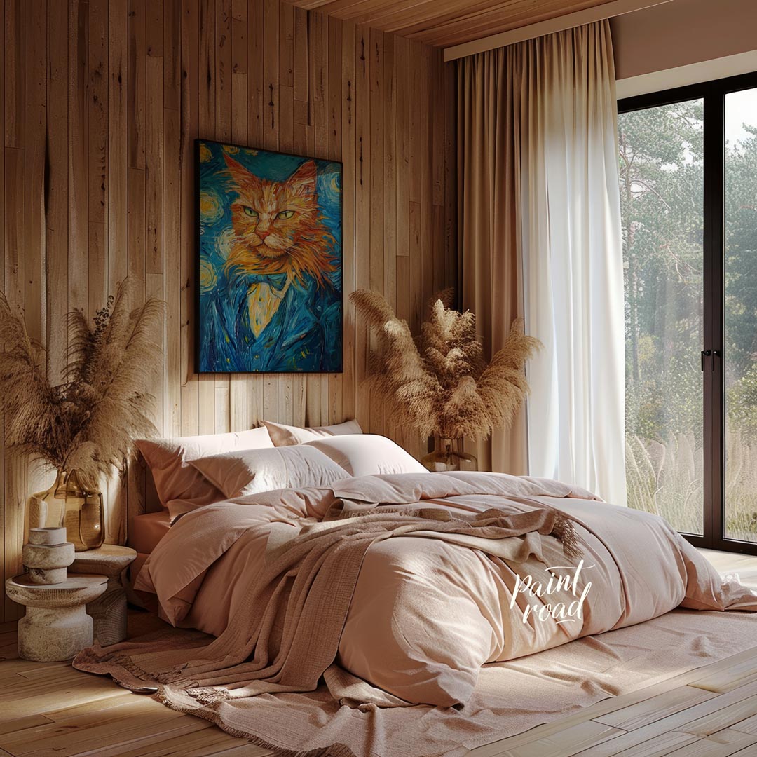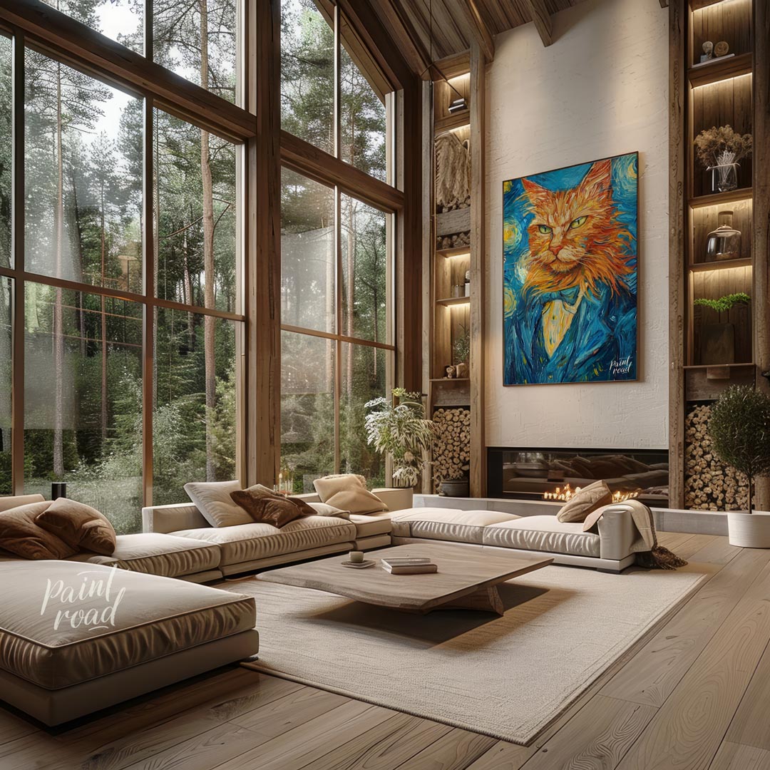 This striking oil painting reimagines a ginger cat in the iconic style of Vincent van Gogh's "The Starry Night." The cat, with piercing green eyes, is depicted wearing a sophisticated blue suit and a yellow bow tie. Its fur is rendered with thick, swirling impasto brushstrokes characteristic of Van Gogh, creating a vibrant and textured effect. The background is a swirling vortex of blues and yellows, mimicking the celestial patterns seen in "The Starry Night," with distinctive circular formations suggesting stars or swirling energy. This artwork cleverly blends classical art with a playful anthropomorphic subject, resulting in a bold, expressive, and truly unique piece that appeals to art enthusiasts and cat lovers alike.