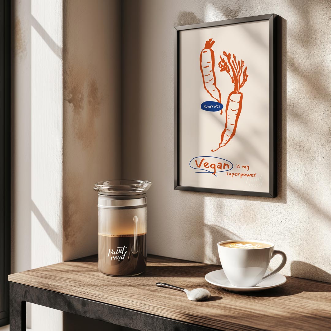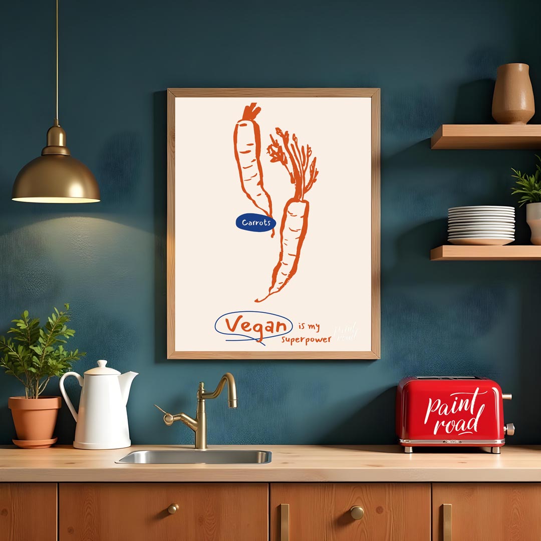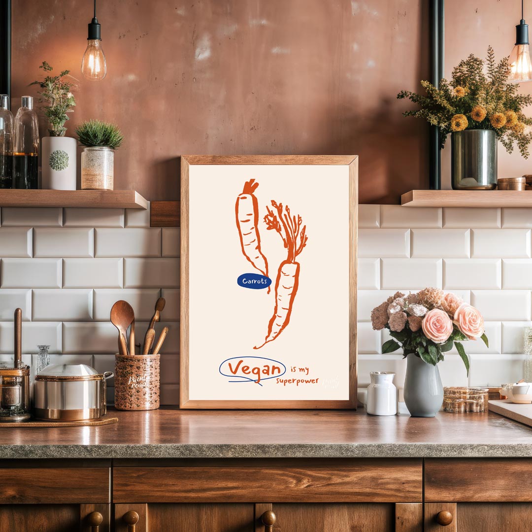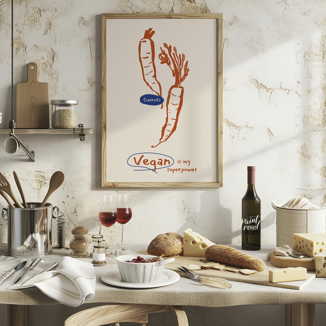 This minimalist yet impactful poster celebrates the vegan lifestyle with a playful declaration. The main visual features two distinct line art carrots, rendered in a bold orange against a light, neutral background. One carrot is upright, while the other is depicted with its leafy greens, highlighting the fresh, natural essence of vegetables. A prominent blue oval labels the vegetables "Carrots," adding a touch of color contrast. Below the illustration, the powerful and inspiring phrase "Vegan is my superpower" is written in a handwritten font, with the word "Vegan" encircled in blue, drawing attention to the core message. This poster is ideal for anyone who embraces or advocates for plant-based living, offering a stylish statement piece for a kitchen, dining area, a health-conscious home office, or even a gym/wellness space. It's a fun and positive affirmation of veganism.