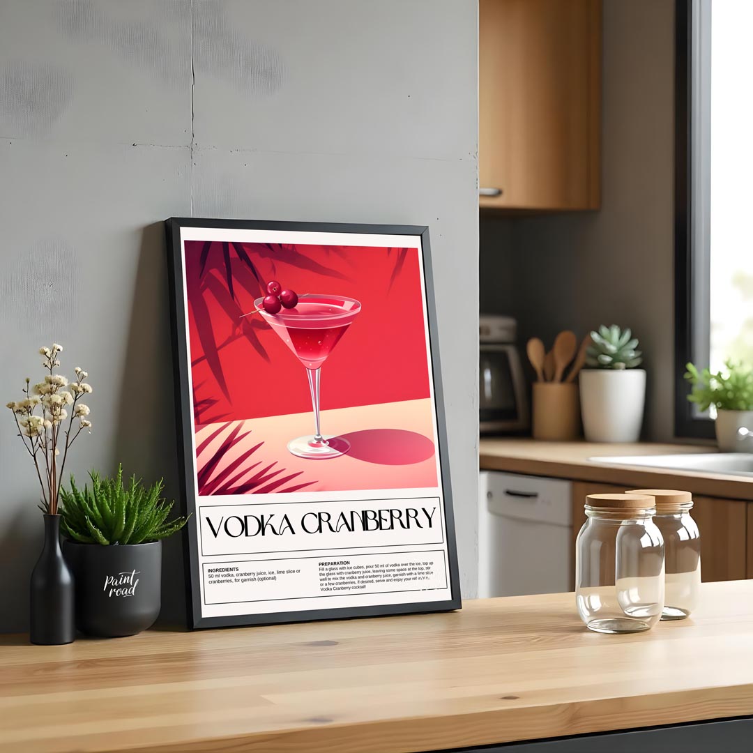 This striking poster features a classic Vodka Cranberry cocktail, beautifully rendered with a vibrant red hue that immediately catches the eye. The drink is presented in a elegant martini glass, garnished with three ripe cranberries, suggesting a refreshing and sophisticated beverage. The background is a minimalist yet dynamic composition of deep red and dark shadows, hinting at palm fronds, which evokes a chic, tropical, or evening lounge atmosphere. Below the prominent "VODKA CRANBERRY" title, the poster clearly outlines both the "INGREDIENTS" and "PREPARATION" steps. The ingredients list specifies 50 ml vodka, cranberry juice, ice, and optional lime slice or cranberries for garnish. The preparation instructions are straightforward, guiding the user to fill a glass with ice, pour vodka, top with cranberry juice, and stir gently. This poster serves as both an artistic piece and a practical guide for crafting this popular cocktail. Its bold colors and clear instructions make it an attractive and functional addition to any space dedicated to entertaining or relaxation. The overall aesthetic is modern and stylish, perfect for those who appreciate simplicity and elegance in their decor and drinks.