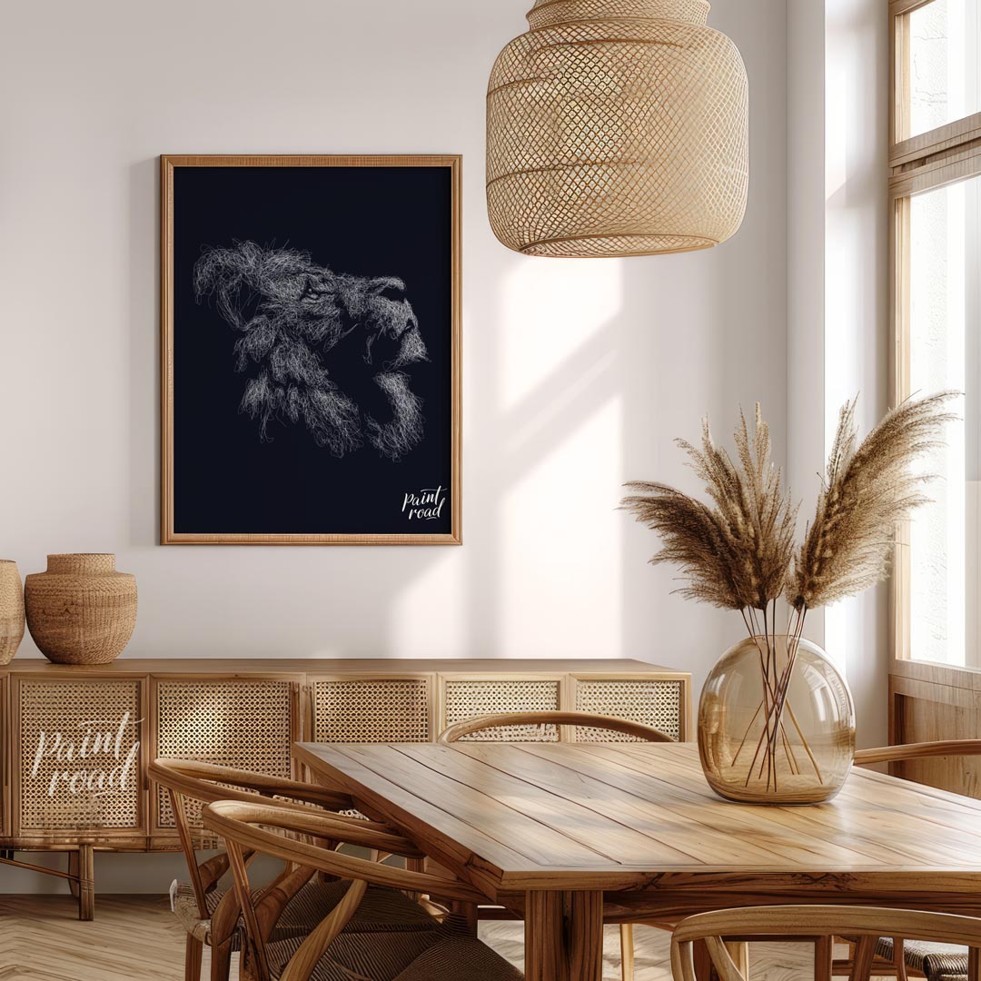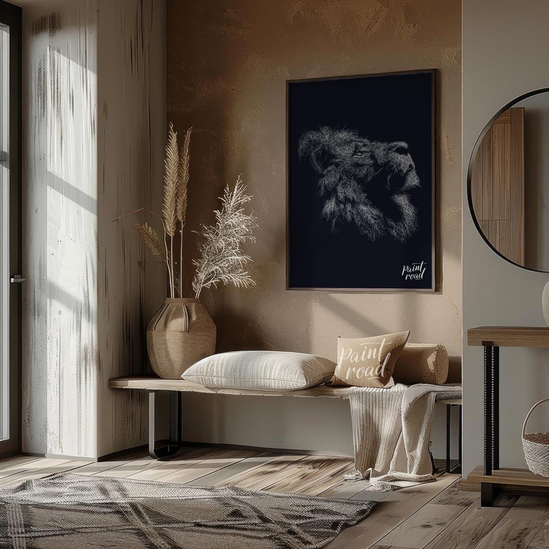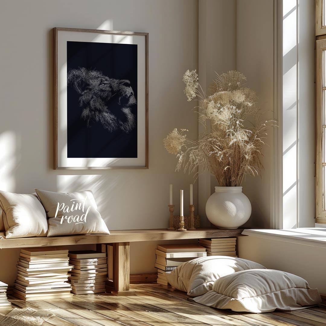 This evocative artwork features the profile of a lion's head, rendered entirely through a dense, intricate network of white, swirling lines against a deep, dark background. The myriad of fine strokes coalesce to form the majestic contours of the lion's face, its powerful jaw, and most strikingly, its voluminous mane, which appears to ripple with unseen energy. The monochrome palette emphasizes texture and form, creating a sense of depth and intensity. The abstract, almost ethereal quality of the lines gives the impression of a creature emerging from or dissolving into the shadows, full of raw power and silent majesty. This piece is a powerful statement, perfect for adding a sophisticated and dramatic touch to a modern or contemporary space. It would appeal to those who appreciate abstract representations of wildlife and strong visual impact.