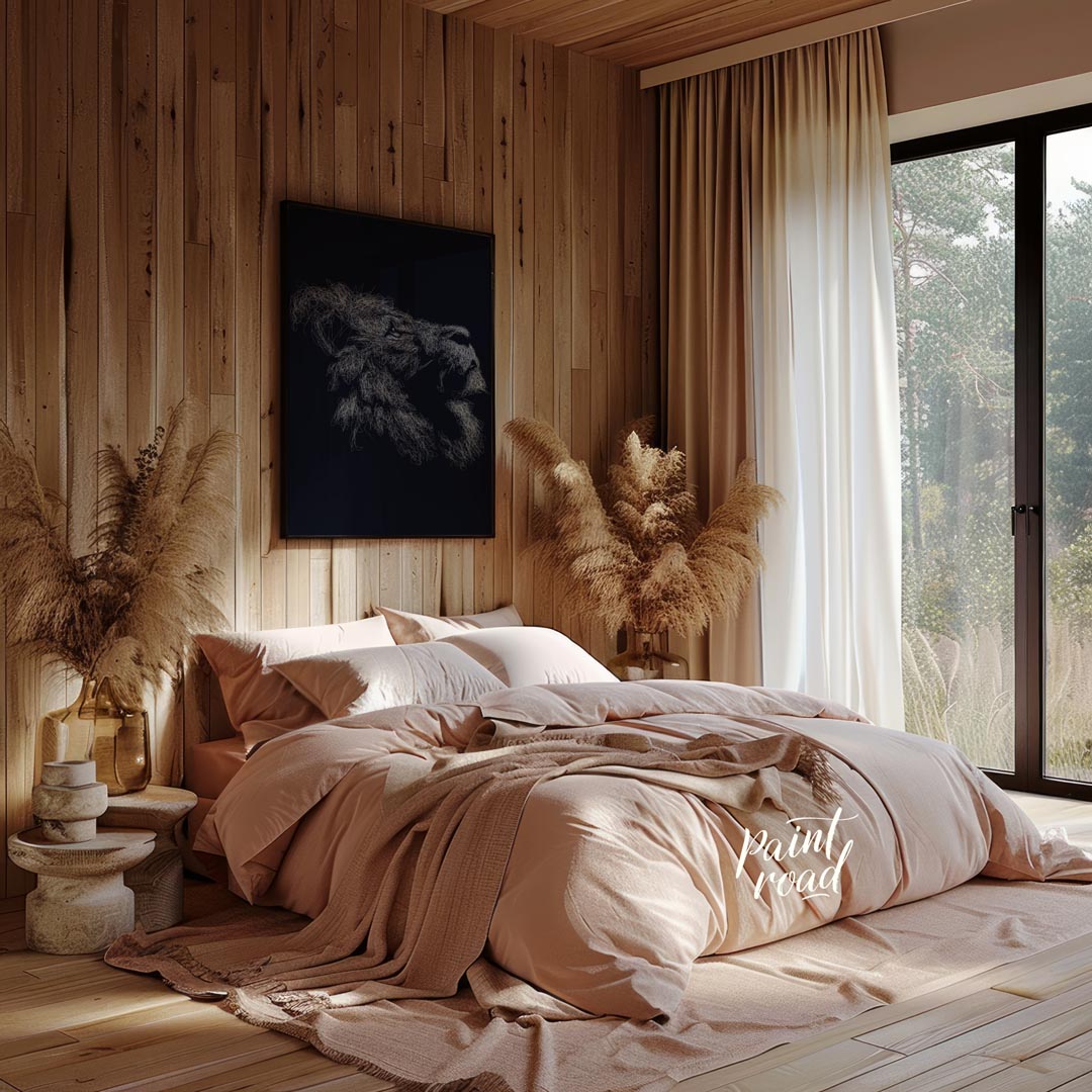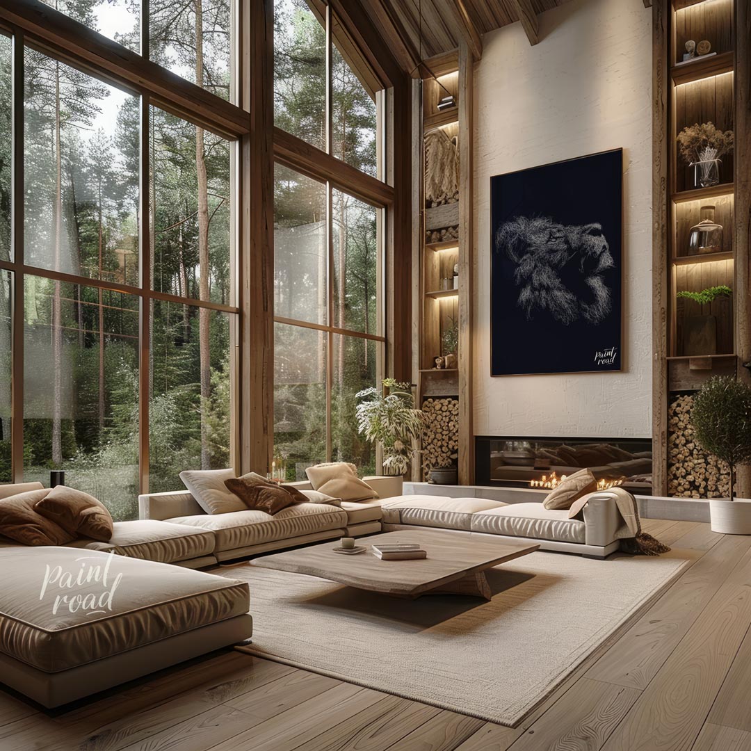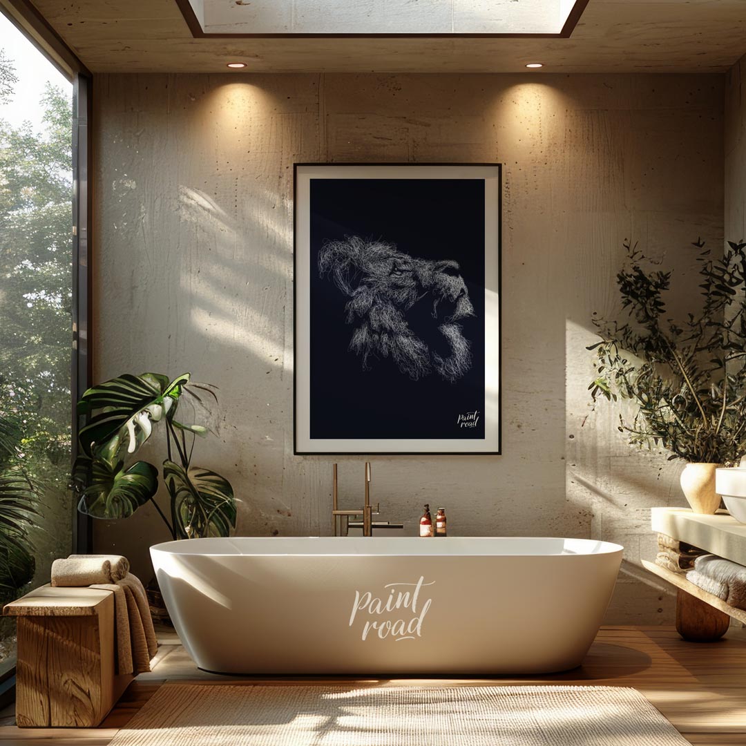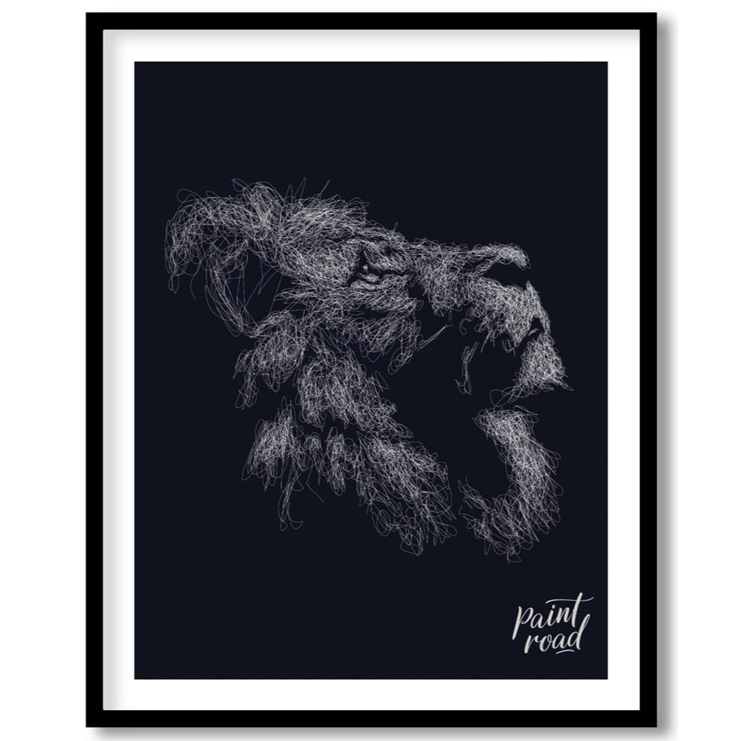 This evocative artwork features the profile of a lion's head, rendered entirely through a dense, intricate network of white, swirling lines against a deep, dark background. The myriad of fine strokes coalesce to form the majestic contours of the lion's face, its powerful jaw, and most strikingly, its voluminous mane, which appears to ripple with unseen energy. The monochrome palette emphasizes texture and form, creating a sense of depth and intensity. The abstract, almost ethereal quality of the lines gives the impression of a creature emerging from or dissolving into the shadows, full of raw power and silent majesty. This piece is a powerful statement, perfect for adding a sophisticated and dramatic touch to a modern or contemporary space. It would appeal to those who appreciate abstract representations of wildlife and strong visual impact.