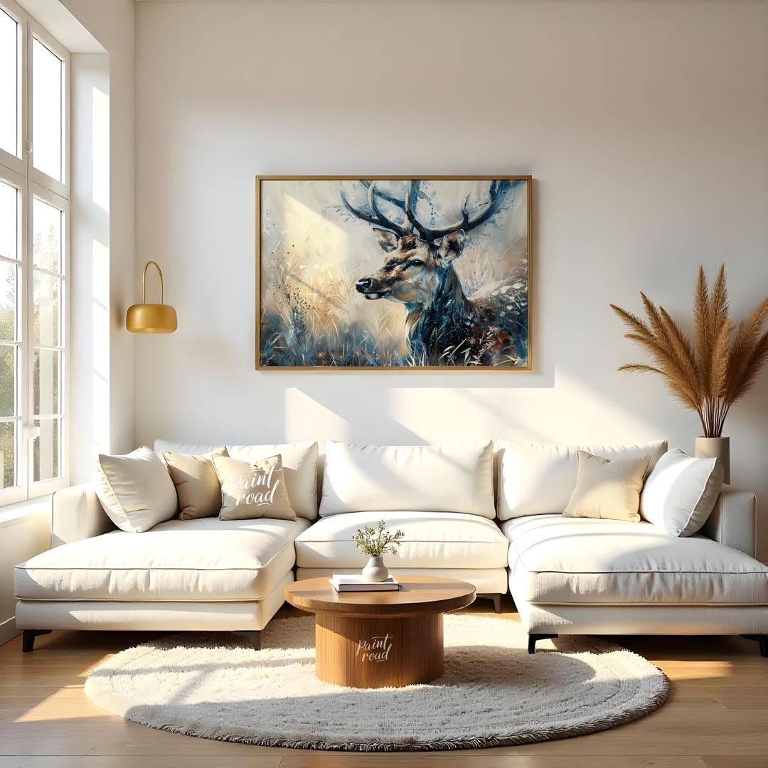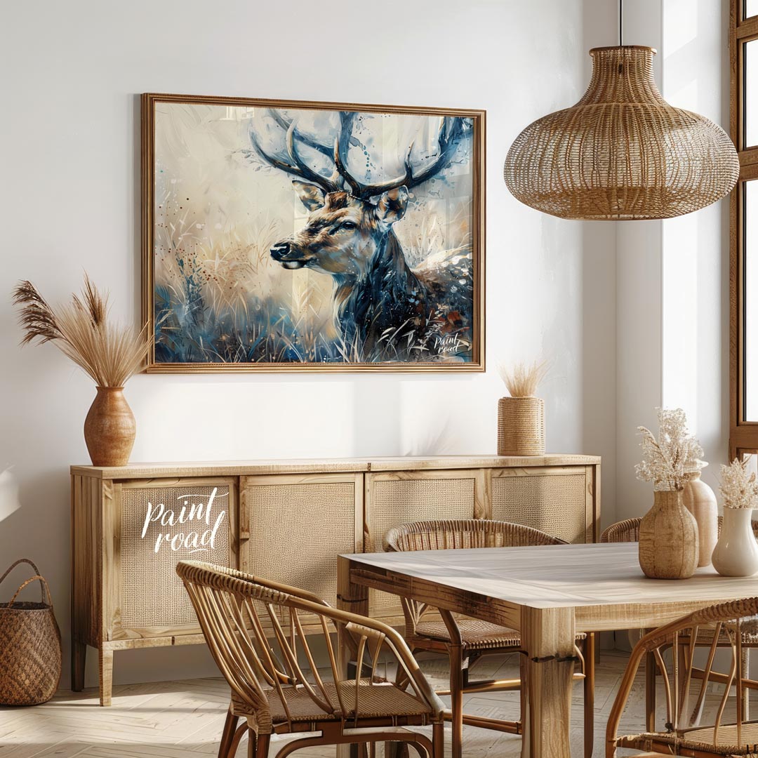 This captivating artwork features a majestic stag, rendered in a beautiful blend of watercolor and sketch-like strokes, emerging from a softly rendered field. The deer's powerful antlers dominate the upper portion, with delicate hints of blue and white suggestive of frost or ethereal energy. Its fur is a mix of natural browns, grays, and whites, accented with painterly splashes of blue and hints of red, giving it a dreamlike quality. The surrounding environment is depicted with loose, expressive brushstrokes, portraying tall grasses in warm yellows and cool blues, creating a sense of movement and depth. Splatters of paint add to the organic, artistic feel. The stag's gaze is gentle yet observant, lending an air of tranquility and quiet strength to the piece. This artwork is perfect for those who appreciate wildlife art with an artistic, impressionistic flair, and would bring a serene natural element to any room.